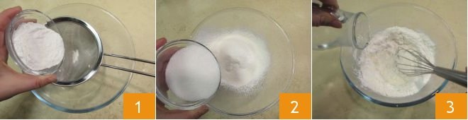 To make the ice cream cone, first gently melt the butter in a saucepan and let it cool. Sift the dry ingredients (rice flour, potato starch, and corn starch) through a sieve 1, add the sugar 2, and start mixing with a whisk while gradually pouring in the hot water 3.