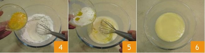 Add the egg 4 and the cooled melted butter 5, continue mixing with the whisk until the ingredients are combined and smooth, without lumps 6.