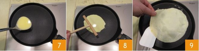 Heat a non-stick pan or crepe maker (no need to grease it) and pour a ladle of batter 7, spread the mixture with the appropriate tool 8 or rotate the pan, aiming for a thin disk about 7-8 inches in diameter. Cook for about 4-5 minutes, then flip the wafer using a spatula or a scraper 9 and cook the other side for 1-2 minutes.