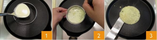 To achieve the shape of tacos made from ice cream wafers, you can proceed as follows: pour a ladle of batter into a 4-inch diameter ring mold placed on a hot griddle 1, wait 3-4 minutes for it to cook, then gently detach the edges from the ring mold 2 and flip the wafer with a spatula 3.