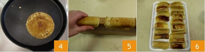 Wait a few minutes (1 or 2 should be enough) for it to become golden on the other side 4, then remove the wafer from the griddle and immediately lay it on the edge of a wooden cutting board or on a 0.8-inch thick surface to give it the typical taco shape by pressing the edges of the wafer 5. Your taco-shaped wafers are ready 6.