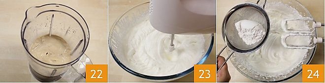 Blend all the ingredients until you get a smooth cream. Before transferring the cream to the glass, prepare the whipped cream. You can consult this procedure by consulting the cooking school card: How to Whip Cream. Then pour the well-chilled fresh liquid cream into a large bowl and with cold beaters of an electric mixer, whip the cream to stiff peaks 23. At this point, add the sifted powdered sugar 24 and incorporate it into the cream with a spatula mixing from the bottom up to avoid deflating.