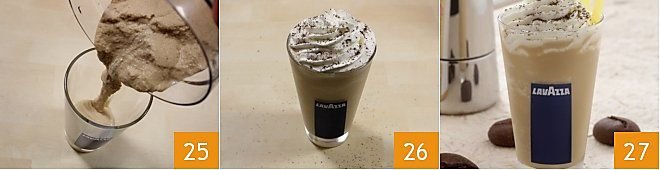 At this point, you can assemble your iced latte: take the iced coffee cream and pour it into a medium tumbler glass (or a tall glass) up to 1.5-2 inches from the top 25. Then add enough whipped cream to garnish the surface and sprinkle as desired with cocoa powder and brown sugar mixed together 26. Repeat the same procedure to prepare the other glasses. Meanwhile, the coffee bean cookies will have cooled and will be excellent to serve as an accompaniment to this tasty iced latte 27.