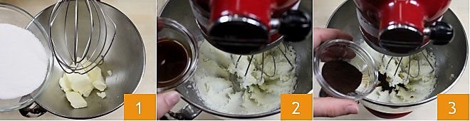 For this recipe, start with the coffee bean cookies that will accompany the iced latte: in a stand mixer (or a large bowl), place the butter in pieces, add the sugar 1, and start whipping until you get a fluffy mixture. Then add the liquid coffee 2 and the coffee powder 3 and mix well with the beaters.