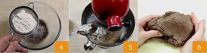In a separate small bowl, add the sifted cocoa powder and flour 4. Mix and pour the mixture along with the other ingredients into the stand mixer (or a large bowl using an electric beater) 5, mix again with the beaters and then continue kneading with the paddle attachment. (If you don't have a paddle attachment, you can finish kneading directly with your hands on the work surface). Transfer the dough to the work surface, and knead with your hands to obtain a homogeneous and pliable dough 6.