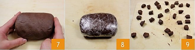 Form a dough ball 7 and cover it with plastic wrap 8. Place it in the refrigerator to rest for at least two hours. After the necessary time, cut the dough ball into small logs and cut them into pieces of 0.5 oz each 9.