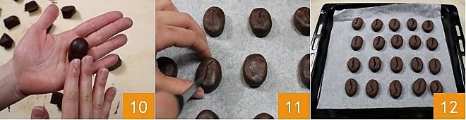 Work each piece of dough with your hands to give it the oval and elongated shape of coffee beans 10. With these quantities, you can make 30 coffee bean cookies. Use a small knife to create a "S" incision on each one 11. Then place them on a baking sheet lined with parchment paper and, before baking, put them in the fridge for another 30 minutes so the dough firms up and holds during baking. After half an hour, take them out of the fridge and bake them in a preheated static oven at 340°F for at least 20 minutes (if using a convection oven, 300°F for 15 minutes). When they are cooked, take them out and let them cool 12.