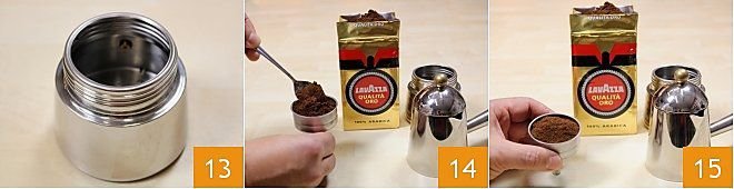 While the coffee bean cookies are cooling, you can focus on the iced latte. Start by preparing the coffee with the moka pot: put cold water, preferably low in calcium, in the boiler up to the safety valve 13 (otherwise you will get a longer coffee). Fill the filter with ground coffee 14 and level it with each added teaspoon by tapping the filter on the table with decisive movements 15, until reaching the edge of the filter.