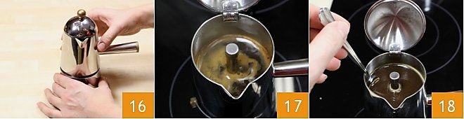 Do not press with the teaspoon, nor make holes, and screw the coffee maker tightly 16 (to avoid coffee escaping from the sides while rising), then place it on a low and constant flame, to get a rich coffee. As the coffee rises, a dense foam will form 17; we recommend not letting the coffee sputter for too long, to maintain its aroma and sweetness. Then turn off the heat and your coffee for use in the preparation is ready: mix it directly in the moka pot with a teaspoon, to make it more homogeneous 18.