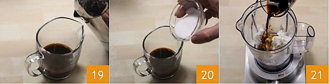 For each glass, in a container pour 1.7 oz of coffee 19, add 2 teaspoons of sugar 20, and mix. In a blender add 6-7 ice cubes, 5 oz of ice cream (3 scoops), 1.7 oz of milk, and the sweetened coffee 21.