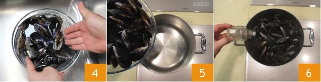 Start by cleaning the mussels. First make sure they are all closed: discard those that are broken or open. Then remove any barnacles with a small knife 1 and pull out the hairy beard 2 that may stick out of the shell. Finally, scrape off the impurities with a clean scourer or stiff brush 3.
