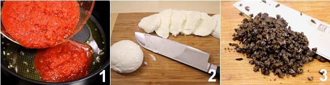 To prepare the pizzaiola-style rolls, start by placing the crushed garlic clove in a large pan with the oil. Brown the garlic and then add the tomato sauce 1, season with salt and pepper and bring to a simmer. Finally, add the oregano and parsley. While the sauce is cooking, lightly pound the slices of meat with a meat mallet, and even them out if they are very irregular. Cut the mozzarella (or scamorza) into thin slices 2 and let it drain on a sieve to remove as much water as possible. Finely chop the black olives 3.