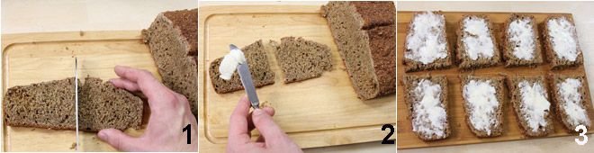 To prepare the Irish bruschettas, take the loaf of multigrain brown bread and slice it about 0.4 inches thick; place them on the cutting board, cut them in half 1, and spread a layer of butter (about 1 tsp) on them using a knife 2. Repeat this step for all the bread slices 3.
