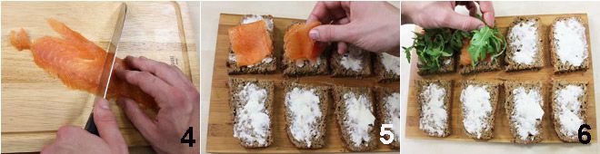 Next, take the salmon and cut it into slices: each slice should weigh around 1 oz and be the same size as the bread slice 4. Then, place each salmon slice on the bread 5 and add a few arugula leaves (about 1 tbsp per slice) on each bruschetta 6.