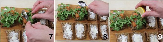 On each slice, add a teaspoon of capers (about 1 tsp) 7, finally season with a pinch of coarse salt 8 and a squeeze of lemon 9. There you go, your Irish bruschettas are ready to be enjoyed!
