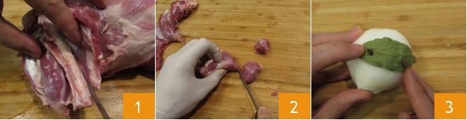 To make the Irish Stew, take the lamb meat and separate the bones from the flesh 1, cut the latter into pieces about 3/4 inch 2. Use the bones to prepare the meat broth needed for cooking: peel an onion and leave it whole, insert cloves and bay leaves into the flesh 3 to flavor.