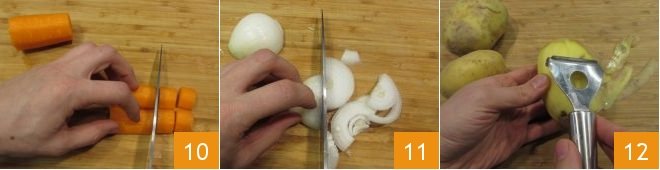 cut them in half lengthwise, and then into small pieces about 3/4 inch 10. Peel the onion and slice it thinly 11. Also peel the potatoes 12.