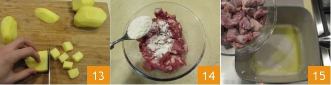 And cut them into cubes, ideally the same size as the meat and carrots 13. Flour the lamb pieces 14, mixing to flour evenly, then place a large pot on the stove, heat the olive oil, and then add the floured pieces 15.