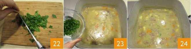 In the meantime, wash and chop the fresh parsley 22. When cooking is complete, turn off the heat and flavor the meat with the parsley 23. Your Irish stew is ready to be enjoyed piping hot 24.