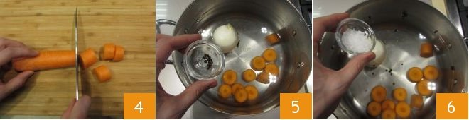 Then cut the carrot into coarse pieces 4, fill a large pot with water, then add the carrot pieces, the onion spiked with bay leaves and cloves, and also add the black peppercorns 5 and juniper berries. Add coarse salt 6.