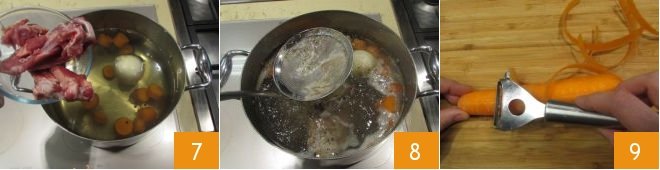 And finally, add the lamb bones 7, cook over moderate heat for about 1 hour, skimming with a slotted spoon occasionally to remove excess fat 8. Once the broth is ready, you can proceed with making the Irish Stew: peel the carrots 9,