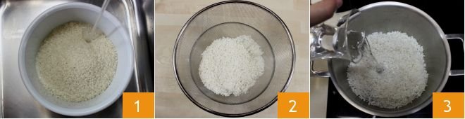 To prepare Italian-style sushi, start by preparing the rice (you can consult the detailed procedure in the Homemade Sushi card): we used 1 cup of raw rice (small and round grains) which will double in weight once cooked. Rinse the rice under cold running water 1: do at least ten rinses, moving the rice with your hands until the water becomes clear. Leave the rice to soak for 15 minutes, then drain it 2 and let it rest for another 15 minutes in the colander. After this time, place the rice in a not-too-wide pot and cover it completely with water 3.