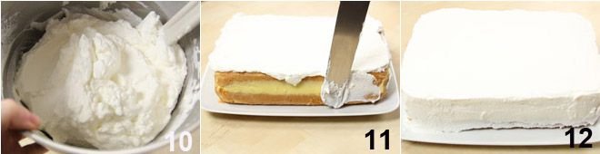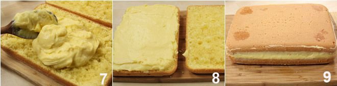 Prepare the custard (to see how to do it Pastry cream), by flavoring the milk that you have heated in a saucepan along with the cream with the grated zest of an organic lemon; when the milk comes to a boil, strain it and proceed normally with the preparation of the classic custard. Let it cool by placing it in the refrigerator in a container covered with cling film that should be in contact with the cream itself (this is to avoid forming the classic hard skin on the surface). Once cold, spread it on one half of the cake 7, keeping a spoonful aside. Smooth it out well 8 and cover the custard with the other half of the cake. With the spoonful of lemon custard kept aside, even out the sides where there might be areas without cream 9.