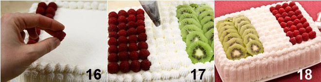 Wash the raspberries and dry them gently, then place them on top of the cake, arranging them in 4 rows of 8. Place the raspberries one by one very regularly 16. Once the red band is obtained, decorate with chantilly cream tufts to form the white central part of the flag. Complete by placing the kiwi slices 17. There you go: your Italy cake is ready to be enjoyed not just with your palate but also with your eyes! Place the cake in the refrigerator for at least one hour before enjoying it and...