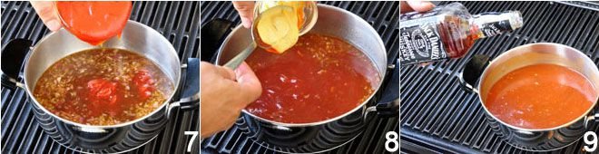 Then add the ketchup 7, mustard and wasabi 8, the Jack Daniel's 9, and let it simmer for about 35/40 minutes over very low heat, stirring occasionally. Remove from heat and let it cool completely before storing in the fridge. The sauce keeps for a few weeks.