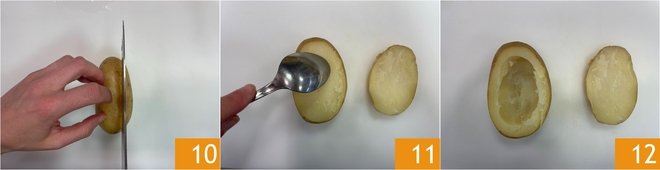 Remove the aluminum foil and prick them with a toothpick to make sure they are soft. Now with a knife, cut off the top cap lengthwise 10. Scoop out the fuller part with a spoon 11, without scooping too much around the edges 12.