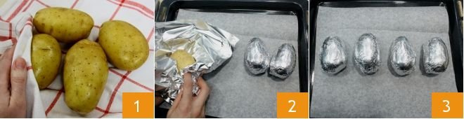 To prepare the jacket potatoes, wash the potatoes under running water, scrubbing them to remove soil residues, then dry them with a clean cloth 1. Then wrap them carefully in aluminum foil 2 and place them on a baking tray lined with parchment paper 3. Bake them in a preheated static oven at 392°F for about 1 and a half hours: after the necessary time, pierce them with the tines of a fork to see if they are cooked.