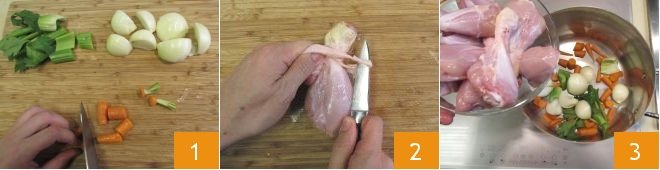 To make jambalaya, first prepare the chicken broth: peel and coarsely chop the onion, celery, and carrots 1, then remove the skin from the chicken drumsticks with the help of a knife 2. Place both the vegetables and the chicken in a large pot 3,