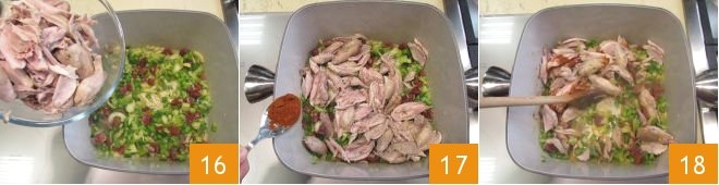 the chicken meat 16, and the Cajun spice mix 17. Mix well 18 and cook over medium heat for another 10 minutes.