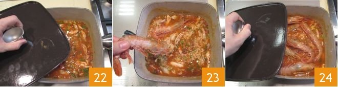 cover with a lid 22, and cook for about 18 minutes or for the time indicated on the rice package, occasionally checking that the liquid has not dried out too much. After 10 minutes, add the whole shrimp 23, close the lid again 24, and continue cooking. Once the rice cooking time is up, the jambalaya should still be slightly brothy at the bottom.
