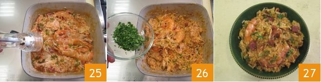 Turn off the heat, add a grind of black pepper 25 and some chopped fresh parsley 26, and your jambalaya is ready to be enjoyed 27!