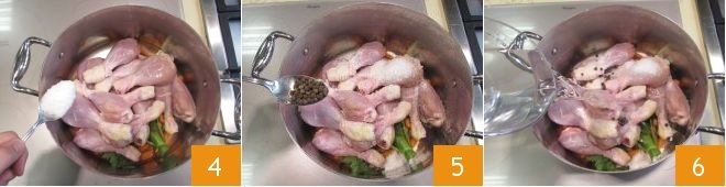 add the coarse salt 4 and the allspice berries 5, then cover everything with water 6.