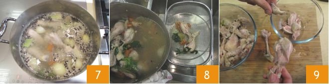 Cook the broth for 50 minutes from the moment the water comes to a boil 7. After this time, strain the broth 8 and keep it warm, then shred the chicken separating the meat from the bones and tendons 9.