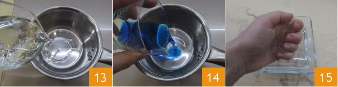 Finally, prepare the last layer of blue jelly. Pour the soda 13 and blue curaçao 14 into a pot. Heat over low heat. Take the last soaked gelatin sheet, squeeze it thoroughly 15