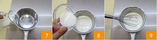 Proceed with the preparation of the panna cotta. Pour the cream 7 into a high-sided pot and heat over low heat. Add the sugar 8 and whisk to dissolve it 9.