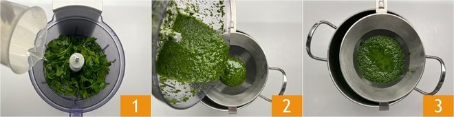 To prepare the Jerusalem artichoke cream with seared scallops, first focus on the green oil: place the parsley in a blender, then pour in the seed oil 1 and blend for 5 minutes. Strain the resulting cream with a fine-mesh sieve 2 and position a bowl underneath to collect the liquid. Place the sieve and bowl in the refrigerator and let it filter for 4 hours 3.