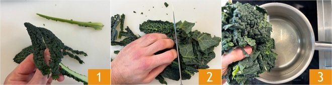 To prepare the kale and chickpea burgers, first clean the kale by separating the stems from the leaves 1, then roughly chop the leaves 2. Place the kale in a pot with boiling salted water 3.