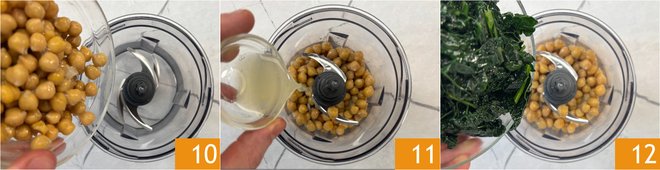 In a mixer, add the drained chickpeas 10 and lemon juice 11, then add the kale 12.