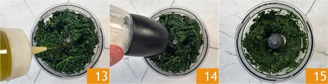 Add the oil 13 and salt 14, then blend to obtain a fairly coarse texture, not perfectly smooth 15.