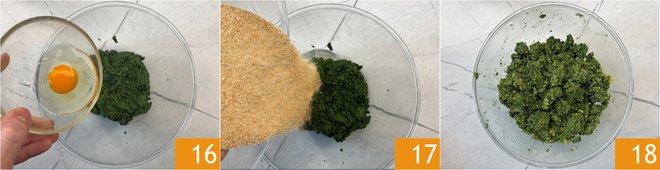 Transfer the mixture to a bowl, then add the egg 16 and the breadcrumbs, little by little 17. Mix well with a fork to combine everything, adjusting the amount of breadcrumbs according to the consistency 18.