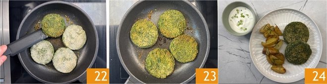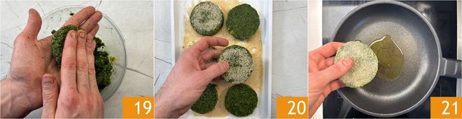 Form the burgers by compacting and slightly flattening some of the mixture on the palm of your hand 19; to get a more precise shape, you can use a glass or a pastry cutter. With these quantities, you will get 6 burgers with a diameter of about 3.5 inches (9 cm). Place them on a tray lined with parchment paper on which you have sprinkled some more breadcrumbs, and cover both sides lightly 20. You are ready for cooking: place the burgers in a non-stick pan in which you have heated a little oil 21.
