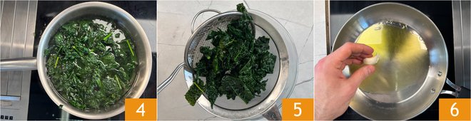Cook the kale for about ten minutes 4, then drain it to remove excess water 5. In a pan, sauté a garlic clove in a drizzle of oil 6.