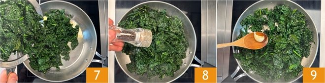 Add the well-drained kale 7, salt, and pepper 8, and sauté for about 10 minutes over medium heat. Turn off the heat, remove the garlic 9, and let it cool slightly.
