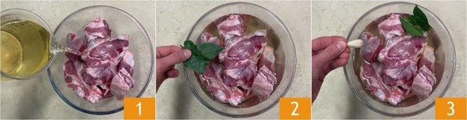 To prepare the kid goat in a pan, first marinate the meat: place the pieces of kid goat in a bowl, then add the white wine 1, the bay leaves 2, and the crushed garlic clove 3.