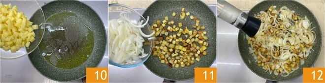 Heat a large pan with a drizzle of oil, then add the potatoes 10 and brown them for about ten minutes. Add the onions 11 and sauté for 3 minutes over medium heat, then lower the heat, salt 12, and pepper.