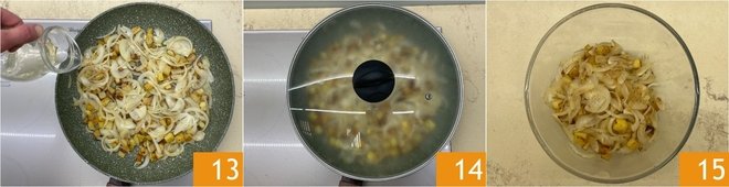 Deglaze with 50 ml (1.7 oz) of white wine 13, cover with the lid, and continue cooking for 5 minutes 14. Once cooked, remove the potatoes and onions from the pan and set them aside 15.